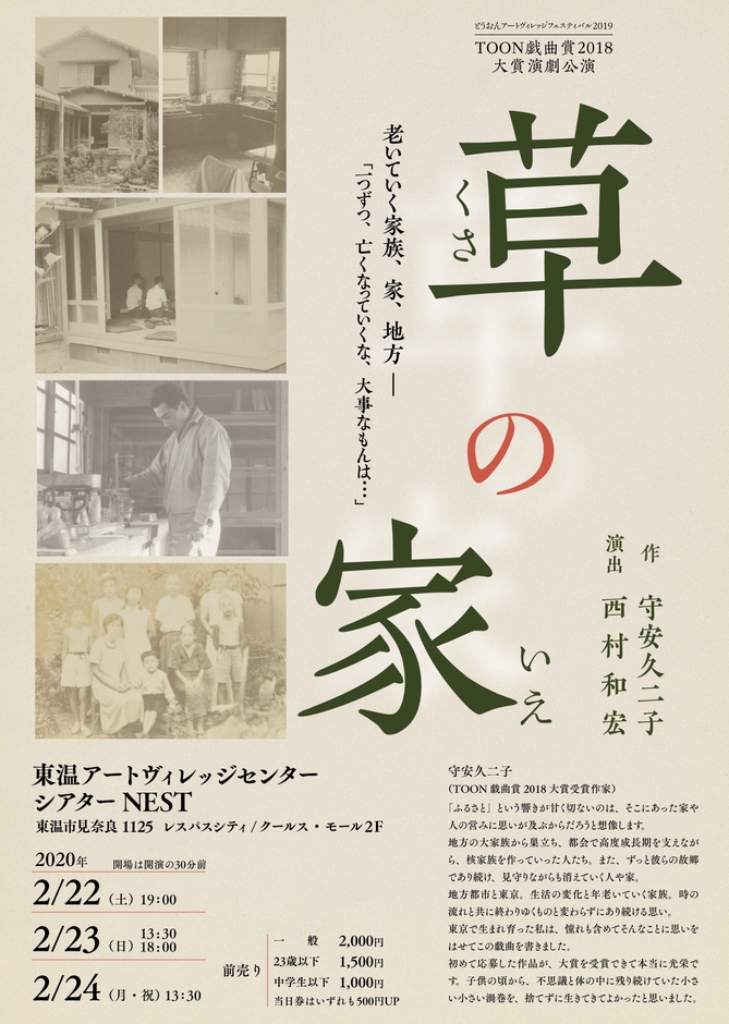 舞台芸術を生かしたまちづくり「アートヴィレッジとうおん構想」を進める愛媛県東温(とうおん)市と同市移住定住促進協議会(事務局:東温市企画政策課)は、「とうおんアートヴィレッジフェスティバル2019」のメインプログラムとして、2020年2月22日(土)から24日(月・祝)の期間で、東温アートヴィレッジセンター・シアターNESTにて、アートヴィレッジTOON戯曲賞2018大賞受賞作品「草の家」を上演します。