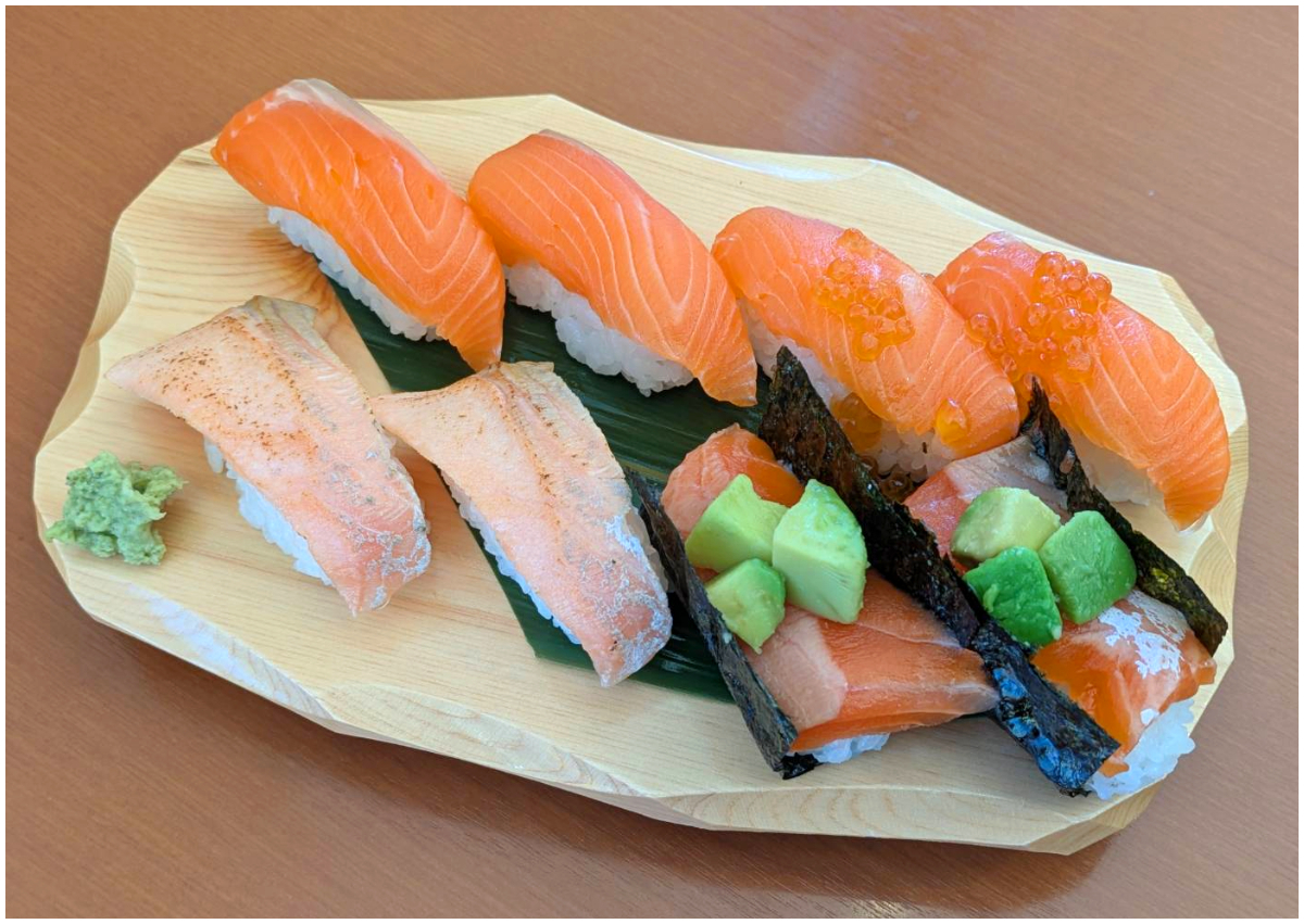 富士山サーモンをお寿司で三つの表情(刺身・炙り・アボカド)で楽しめるランチ限定メニューです。