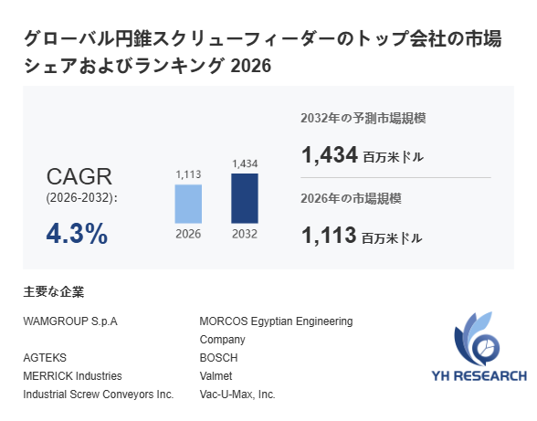 YHResearch調査チームの最新レポート「グローバル円錐スクリューフィーダーのトップ会社の市場シェアおよびランキング 2026」によると、2026年の1113百万米ドルから2032年には1434百万米ドルに成長し、2026年から2032年の間にCAGRは4.3%になると予測されています。