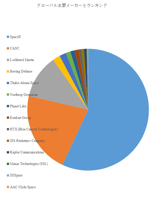 LP Informationのトップ企業研究センターによると、世界の主要衛星製造業者にはSpaceX、CASC、Lockheed Martin、Boeing Defense、Thales Alenia Space、Northrop Grumman、Eutelsat Group、Planet Labs、RTX(Blue Canyon Technologies)、ISS-Reshetnev Companyが含まれる。2024年時点で、売上ベースの世界トップ10企業が約74.0%の市場シェアを占めており、高い集中度を示す。一方で、小型衛星や特定用途に特化した企業も技術力で存在感を高めている。巨大企業による垂直統合と、専門企業のニッチ戦略が同時進行する点が、衛星市場の競争構造を特徴づけている。