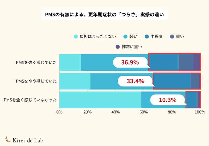 PMS(月経前症候群)をある程度以上感じていた人では、更年期症状の負担が「中程度以上」と回答した割合は約35%となり、「まったく感じていなかった人」(10.3%)に比べて約3.5倍高い結果となりました。