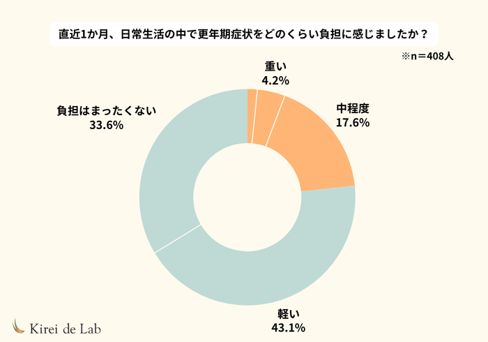 さらに、運動を週3回以上行っている人では、更年期症状の負担が「中程度以上」と回答した人が14.5%と低く、「ほとんどしていない人」(中程度以上:25.7%)よりも軽く感じる傾向が見られました。
