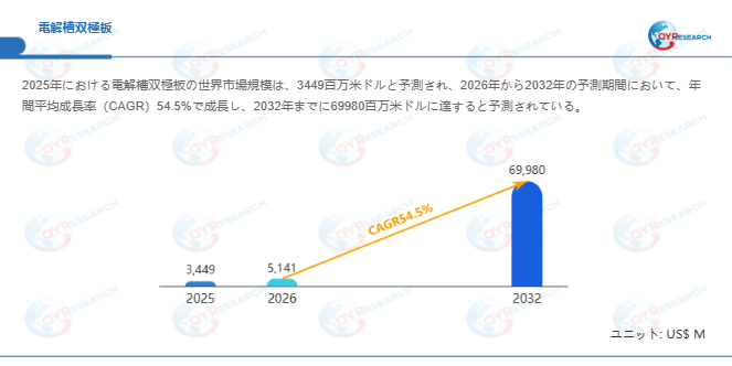 電解槽双極板は、水素製造に用いられる電解槽の中核部材として、グリーン水素需要の拡大とともに市場拡張が加速している。電解槽双極板の世界市場は、2025年に3449百万米ドルと推定され、2026年には5141百万米ドルに達すると予測されています。その後、2026年から2032年にかけて年平均成長率(CAGR)54.5%で推移し、2032年には69980百万米ドルに拡大すると見込まれています。本市場は「電解槽双極板」「水素製造」「PEM電解槽」「アルカリ電解槽」を中心に再編が進み、脱炭素政策とエネルギー転換の進展が主要な需要ドライバーとなっている。