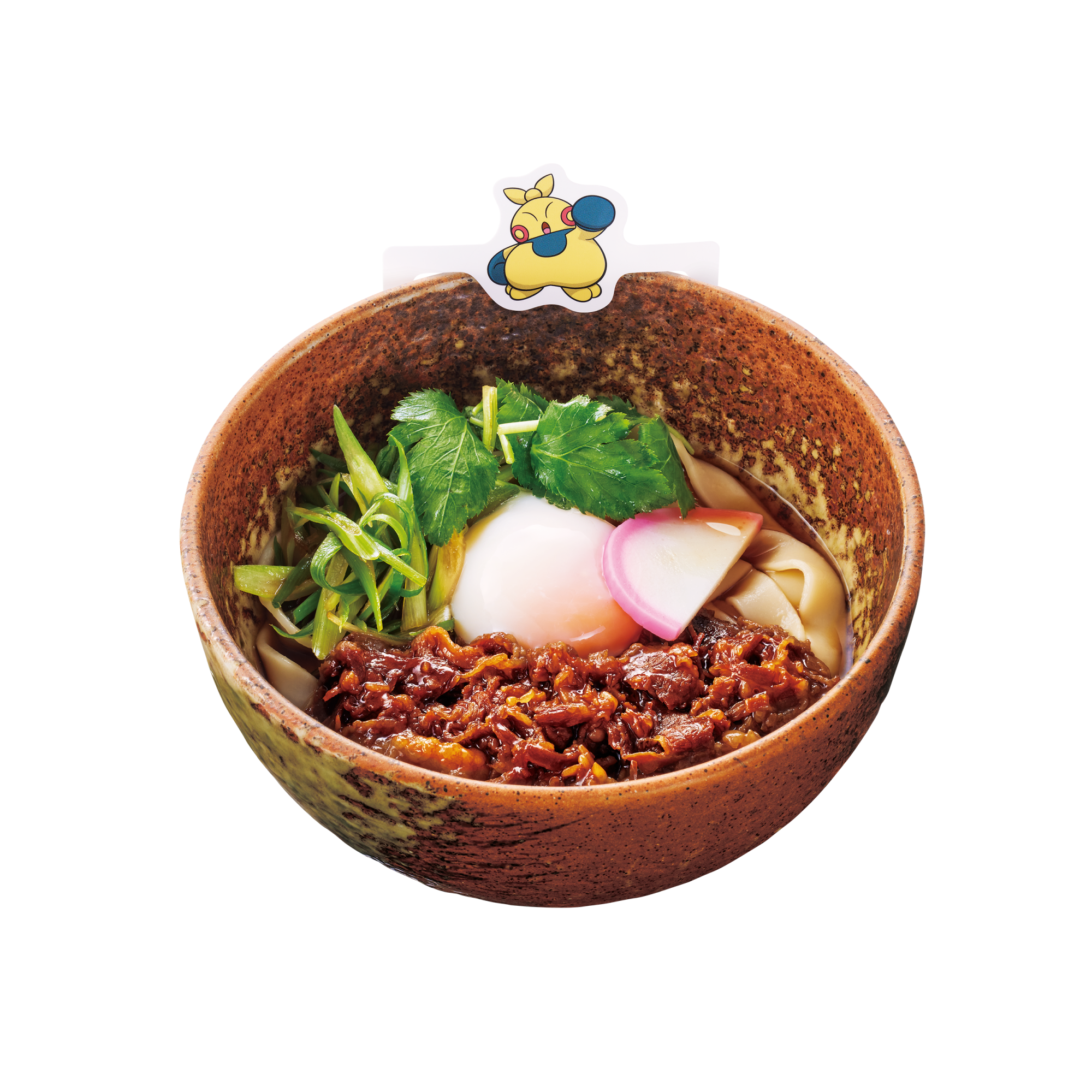 メタモンの色味を表現した、ふわふわ桜色のつみれとエビ入りのスープにつけて食べる一杯です。魚粉の旨みが効いたコクのあるスープに、つるっともちもちの麺を浸してすすれば、一口ごとにエビの香ばしい香りがふわりと広がります。ふわふわのつみれ、ぷりぷりのエビ、もちもちのきしめん。異なる食感が生み出すハーモニーをゆったりとご賞味ください。