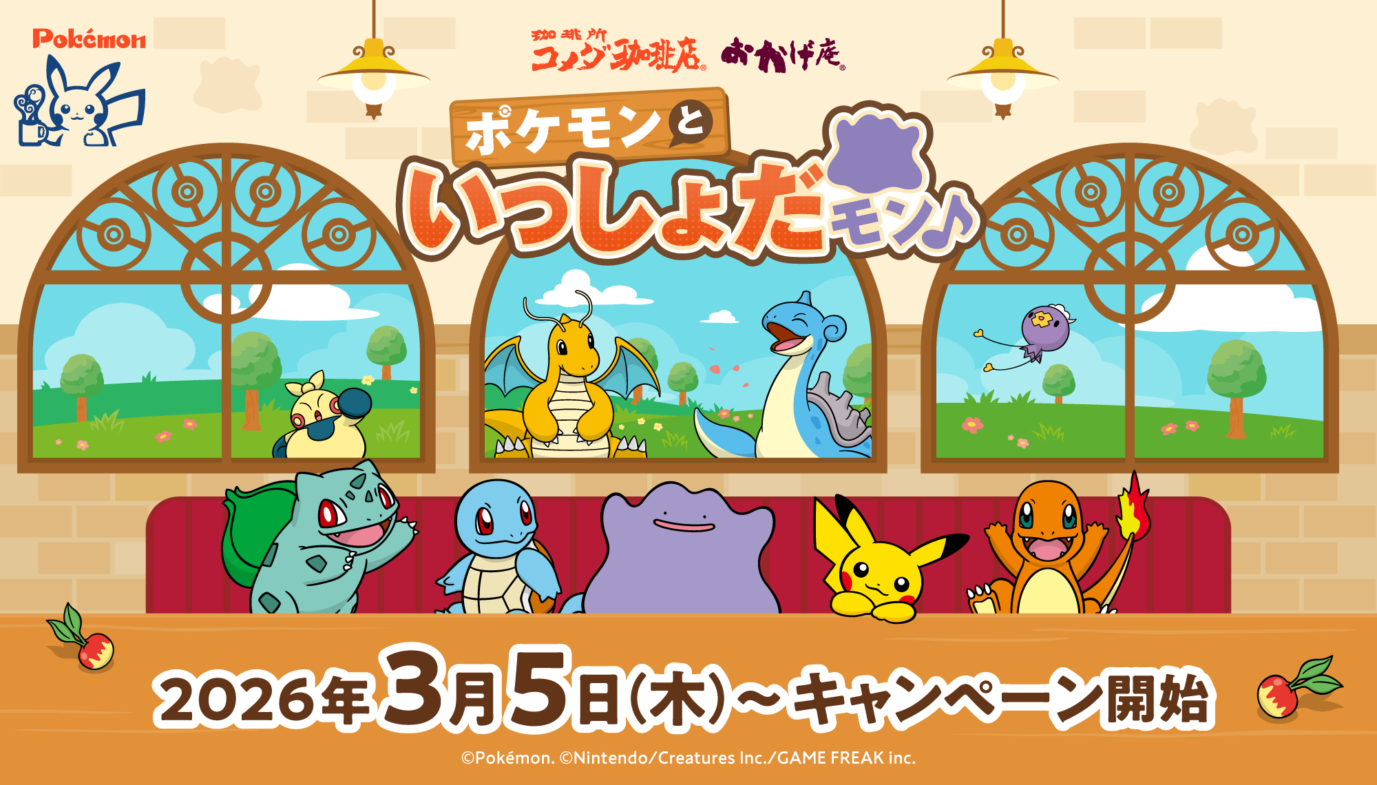 全国にフルサービス型の喫茶店を展開する株式会社コメダ[本社:愛知県 代表取締役社長:甘利祐一 グループ店舗数:1,143店舗(2026年1月末時点)]は、全国のコメダ珈琲店とおかげ庵で2026年3月5日(木)から「ポケモンといっしょだモン♪」をテーマにしたキャンペーンを実施いたします。オリジナルメニューもグッズも空間も、ポケモンの魅力がちりばめられた特別なひとときをお楽しみください。