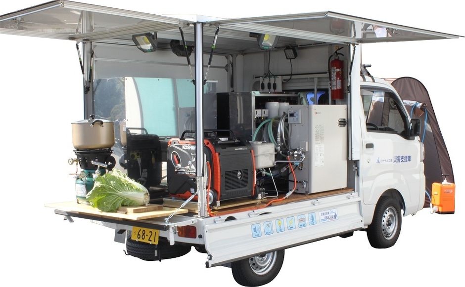飲料水を確保する非常用浄水器、発電機、照明、調理バーナー、 温水シャワー、拡声器などを装備 装備品は用途に合わせてカスタマイズが可能