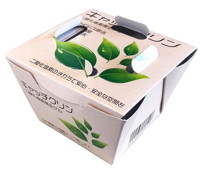 二酸化塩素は強力な酸化力を持ち、有機物と瞬時に反応して不活性化させる作用があり、この二酸化塩素を空気中に簡便に揮散させる仕組みを作りました。二酸化塩素は、SARS、MERSなどのコロナ形状を持ったウイルスに効果がある事が知られ、さらに極めてうすい濃度で効果を発する事が知られています。また、強力な消臭効果も併せ持っており、またトリハロメタンなど有害物質発生の心配のないものです。
