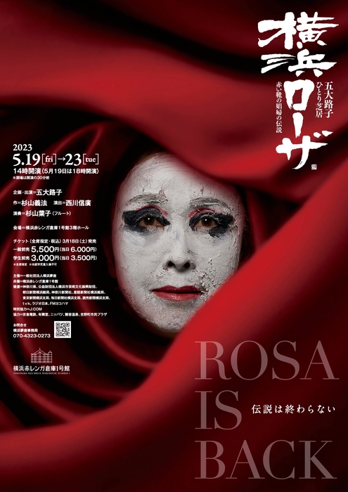 一般社団法人横浜夢座(代表:五大路子)主催、『五大路子ひとり芝居「横浜ローザ」赤い靴の娼婦の伝説』が2023年5月19日(金)~23日(火)に横浜赤レンガ倉庫1号館 ホール(神奈川県横浜市中区新港1丁目1-1)にて上演されます。