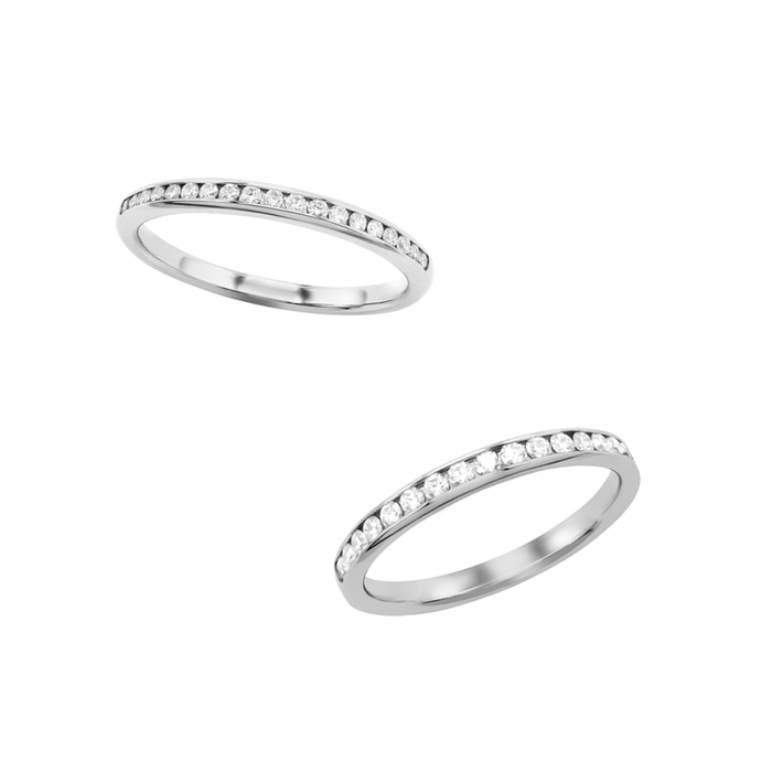 強度が高く傷がつきにくい、「鍛造製法」のハーフエタニティリング。鍛造製法とは、金属に圧力をかけて細かな気泡を抜き、強度を上げる製法です。またリングの内側を丸く削った内甲丸仕様で、指当たりがよく軽やかな着け心地に。レール留めという爪のない石留めで引っ掛かりがなく、すっきりとしたフォルムに仕上げました。傷や変形に強いだけでなく、ハーフエタニティリングの華やかさ、着け心地の快適さを兼ね備えた、こだわりのマリッジリングです。計0.12ctと計0.25ctの2タイプからお選びいただけます。