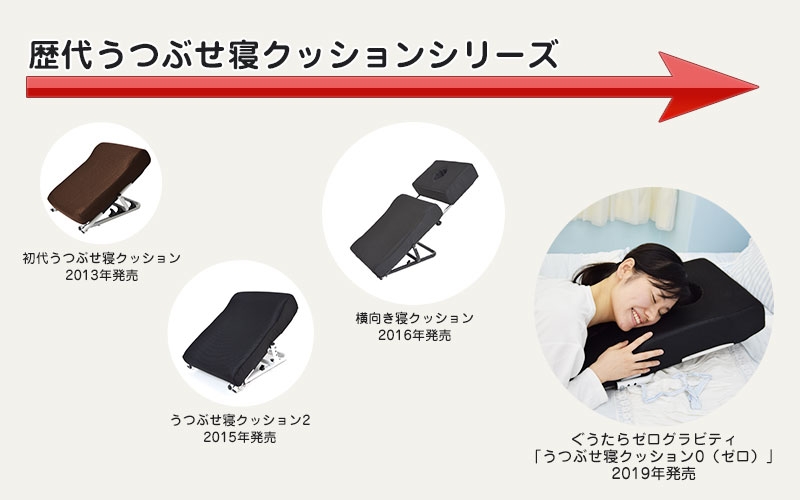 本製品はうつぶせの体勢時にかかるひじや肩、頭の重さを支えて長時間でも楽にうつぶせができるようになるクッションです。初代2013年の「うつぶせ寝クッション」を開発して発売以来、今回で4代目となります。