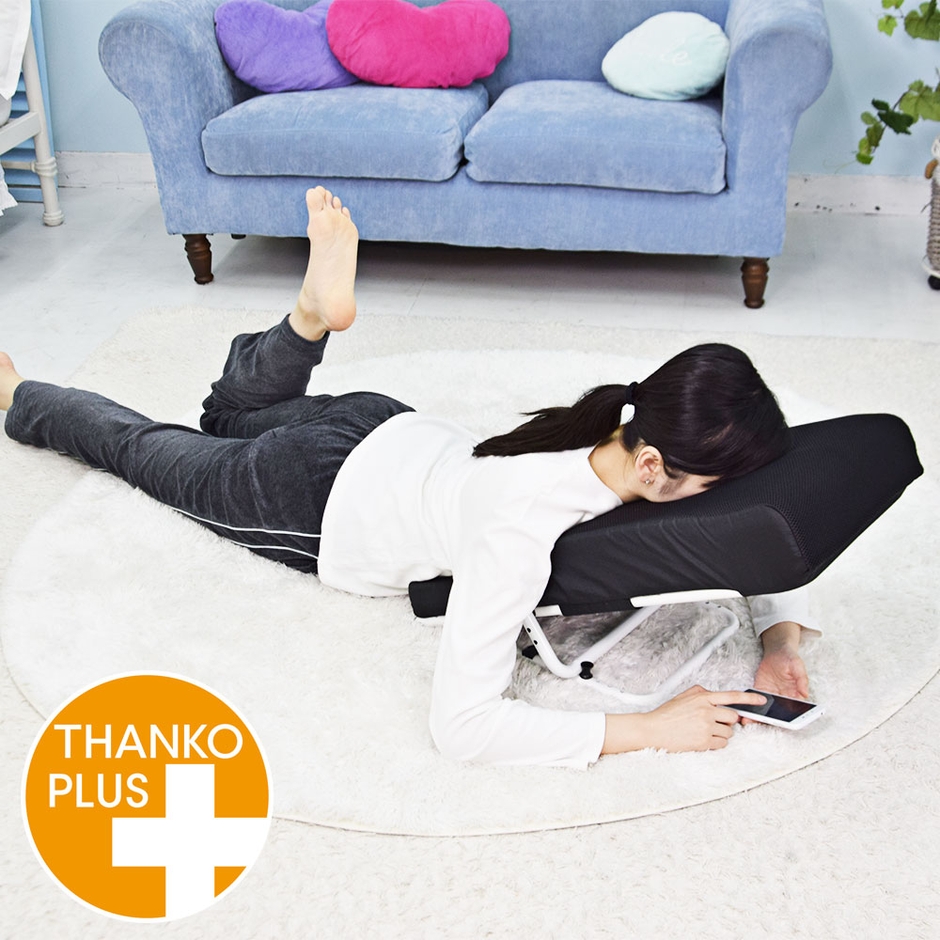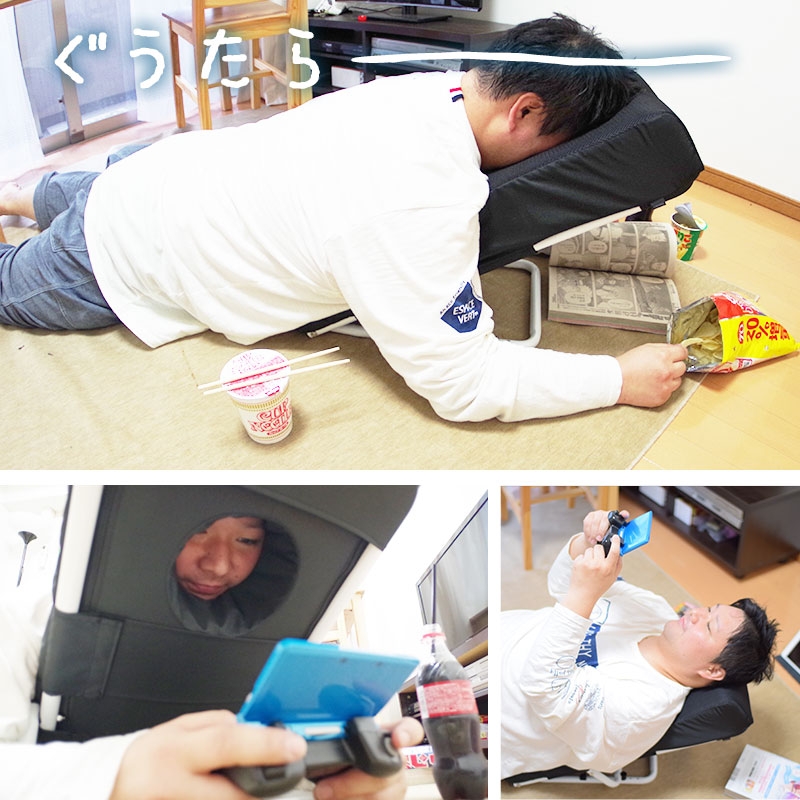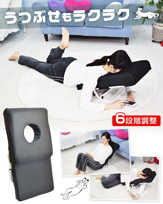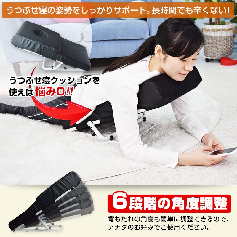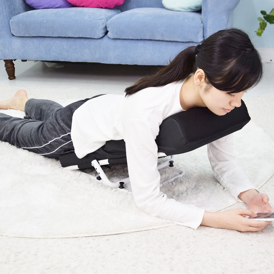 フレームと肉厚のクッションで、しっかりと体重を支えて常に楽な体勢でリラックスできます。クッション部に丸い穴があり、顔をのせて覗き込むような形で使用すれば、顔の重さをクッション全体で支えて首の負担を減らして使えます。うつぶせ以外にも仰向けや横向き、背もたれとしても使用可能。使わない時はスタンド部を折りたたんで収納でき、邪魔になりません。うつぶせしてゲームや読書、スマホを見たりするとひじや肩、首が痛くなる。クッションを体の下に入れても形が崩れて楽なポジションにするのが難しい。長時間楽な状態でぐうたらしたい。そんな方にお勧めの「うつぶせ寝クッション0(ゼロ)」です。