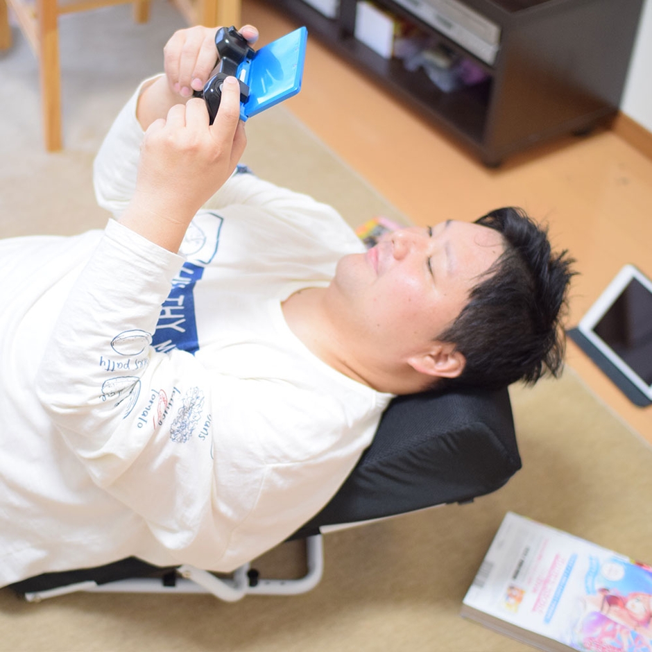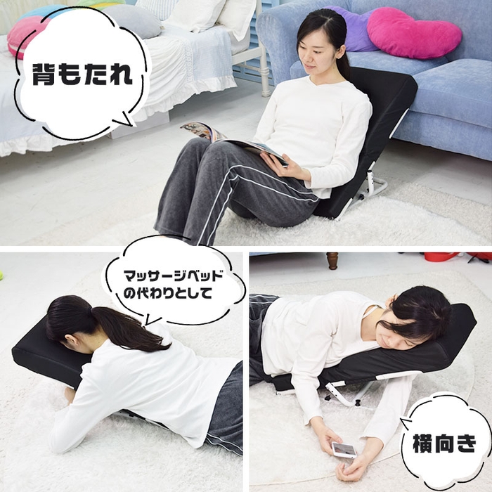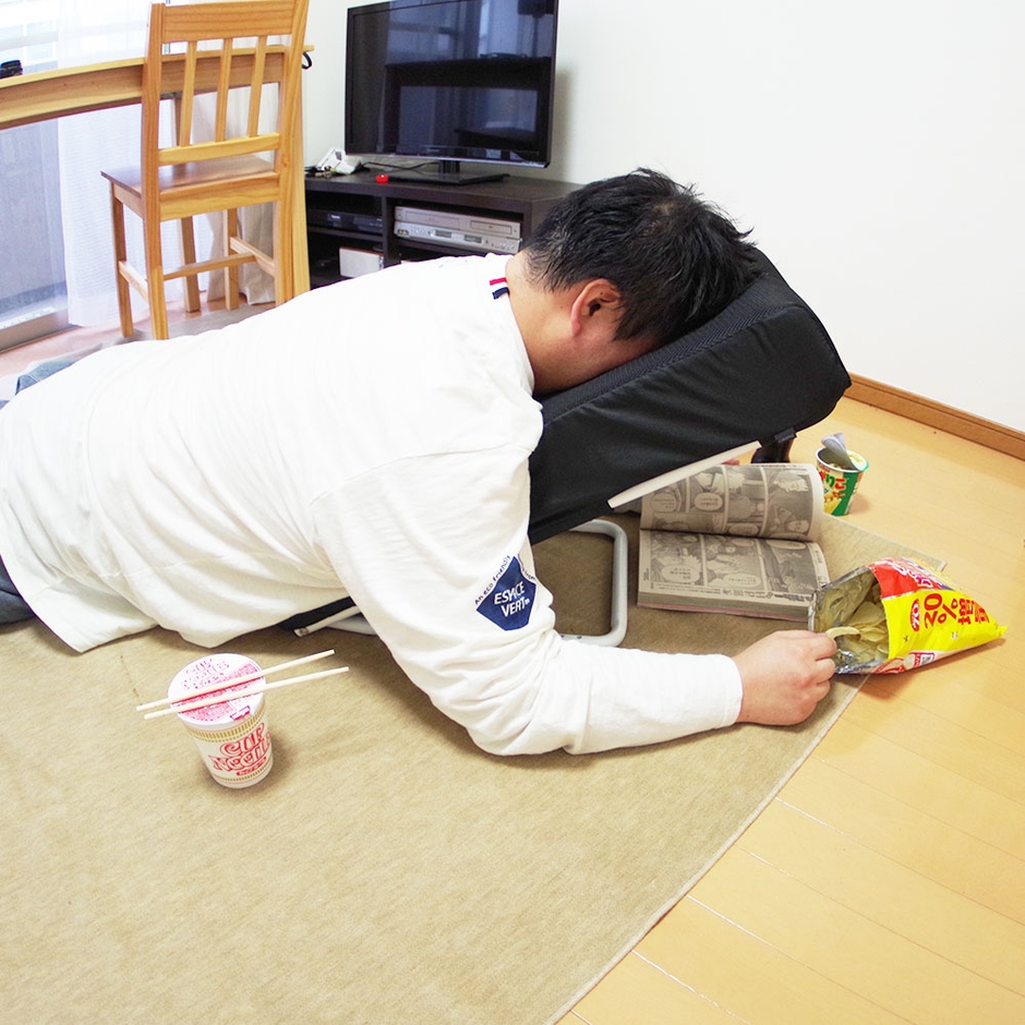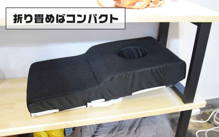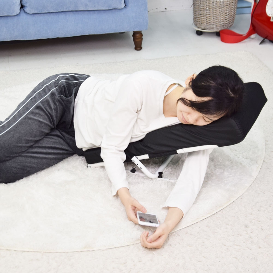 フレームと肉厚のクッションで、しっかりと体重を支えて常に楽な体勢でリラックスできます。クッション部に丸い穴があり、顔をのせて覗き込むような形で使用すれば、顔の重さをクッション全体で支えて首の負担を減らして使えます。うつぶせ以外にも仰向けや横向き、背もたれとしても使用可能。使わない時はスタンド部を折りたたんで収納でき、邪魔になりません。うつぶせしてゲームや読書、スマホを見たりするとひじや肩、首が痛くなる。クッションを体の下に入れても形が崩れて楽なポジションにするのが難しい。長時間楽な状態でぐうたらしたい。そんな方にお勧めの「うつぶせ寝クッション0(ゼロ)」です。