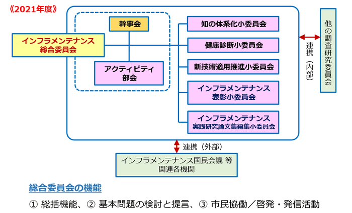 インフラメンテナンス総合委員会は、それまで個別に活動していたメンテナンス関連の委員会を統合し、体系的かつ有機的に活動することを目的として2020年度に発足した委員会です。笹子トンネル天井板落下事故に端を発したインフラの老朽化問題や、近年頻発している豪雨災害・地震災害に対するメンテナンスの重要性に鑑み、委員長は時の会長があたり、2023年度は田中 茂義が務めました。