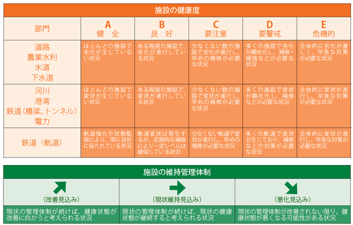 インフラの健康診断は、人の健康同様、①現在の健康状態、②健康を維持あるいは回復するための日常の行動である維持管理体制、の2 点を基本として評価を行っています。