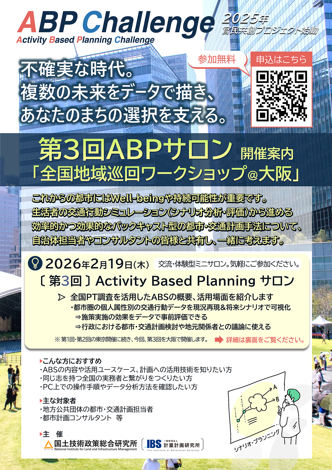 国土交通省 国土技術政策総合研究所(以下 国総研)では、都市における各個人の1日の活動・移動データをシミュレーション技術等により再現し、都市・交通計画等のプランニング技術に活用していく、官民共創プロジェクト「ABP Challenge(Activity Based Planning Challenge)」を策定し推進しています。2025年11月からは、ABPの実現に向けた官民のコミュニティ形成を進める場として、関連技術情報の提供や、関心層同士の交流の機会を提供する『ABPサロン』を継続開催しています。