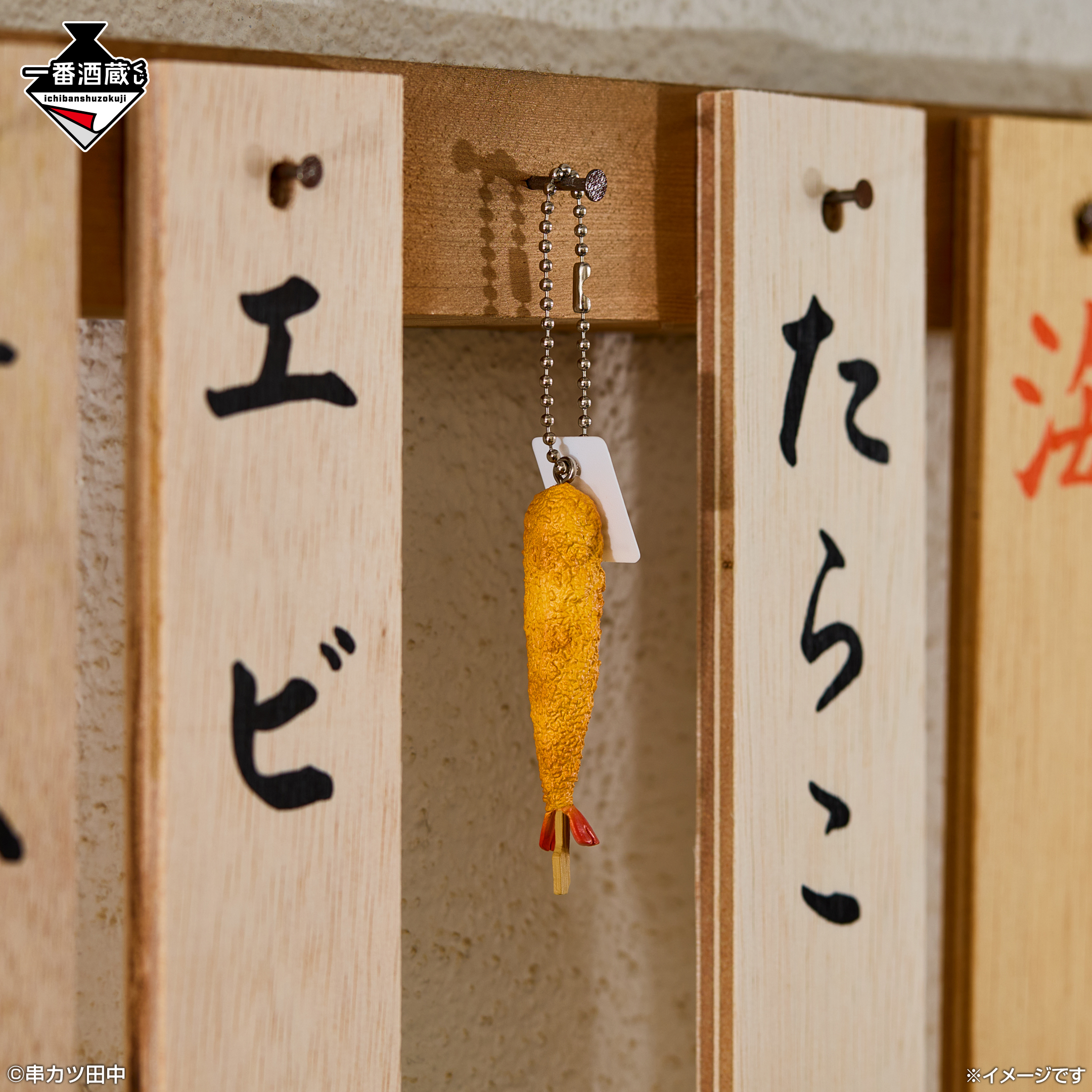 A賞はお店のちょうちんをイメージした、串カツ田中のロゴが入ったライトです。B賞はお店のチンチロリンが家でも楽しめる、サイコロとセットになったどんぶり。C賞はメニュー表がそのままビッグサイズになったインパクト大のタオルです。D賞は実際にお店で使用しているデザインを再現したジョッキ。E賞は本物の串カツを3Dスキャンして再現したミニチュアチャームです。おいしそうな揚げ加減にもこだわりました。そのほか、メニュー表やポスター、一番酒蔵くじオリジナルデザインの選べるステーショナリーアソートやお店のロゴやリアルな串カツの柄など、楽しいデザインに仕上げた選べるタオルコレクション、ラバーコースター・マーカーチャーム・クリップの日常で使えるラバーコレクションなどいずれも串カツ田中の魅力がいっぱいの一番酒蔵くじならではのアイテムをそろえました。