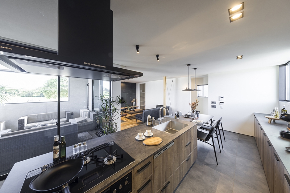 GLAMP最大の特徴は、見学した方々が口を揃えて「実際に見るとその良さに圧倒される」という、2階の開放感です。アウトドアリビング、屋内リビング、ダイニング、キッチンで構成された空間は、大きなガラス窓から視界が抜け、GLAMPの目印である十字窓や、屋根の半分が開いているアウトドアリビングの空へとつながり、想像以上の広がりを感じることができます。
