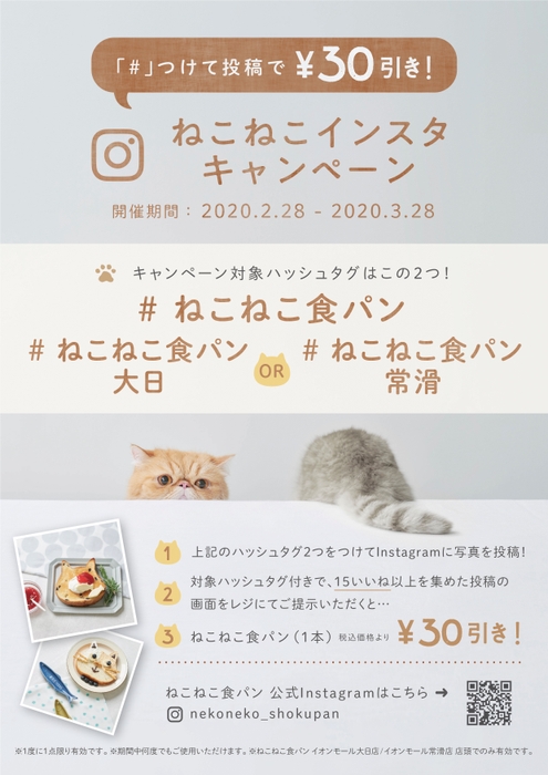 ご自身のインスタグラムに下記の2つのハッシュタグを付けて「ねこねこ食パン」を投稿していただき、「♥15いいね」をゲットすると、ねこねこ食パン1斤が30円引き!