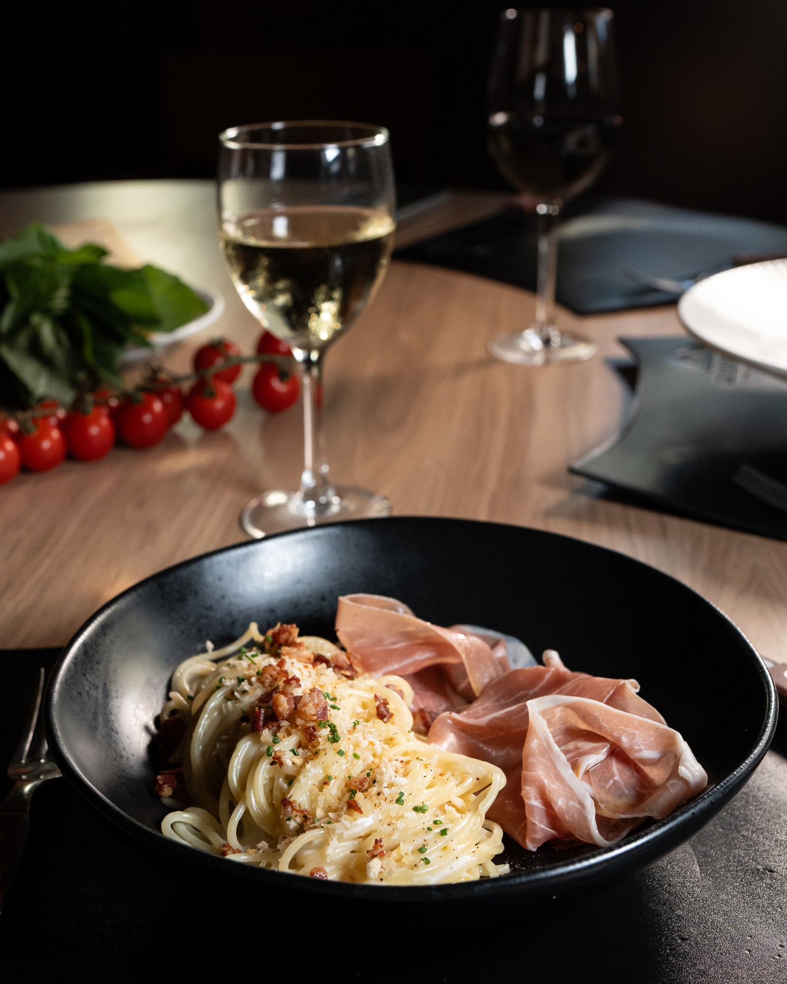 パルミジャーノ・フォンデュータとプロシュート・ディ・パルマのスパゲッティは、フレッシュなスパゲッティを、濃厚でクリーミーなパルミジャーノ・フォンデュータソースで和え、繊細なプロシュート・ディ・パルマ(パルマ産生ハム)のスライスを添えた一品です。