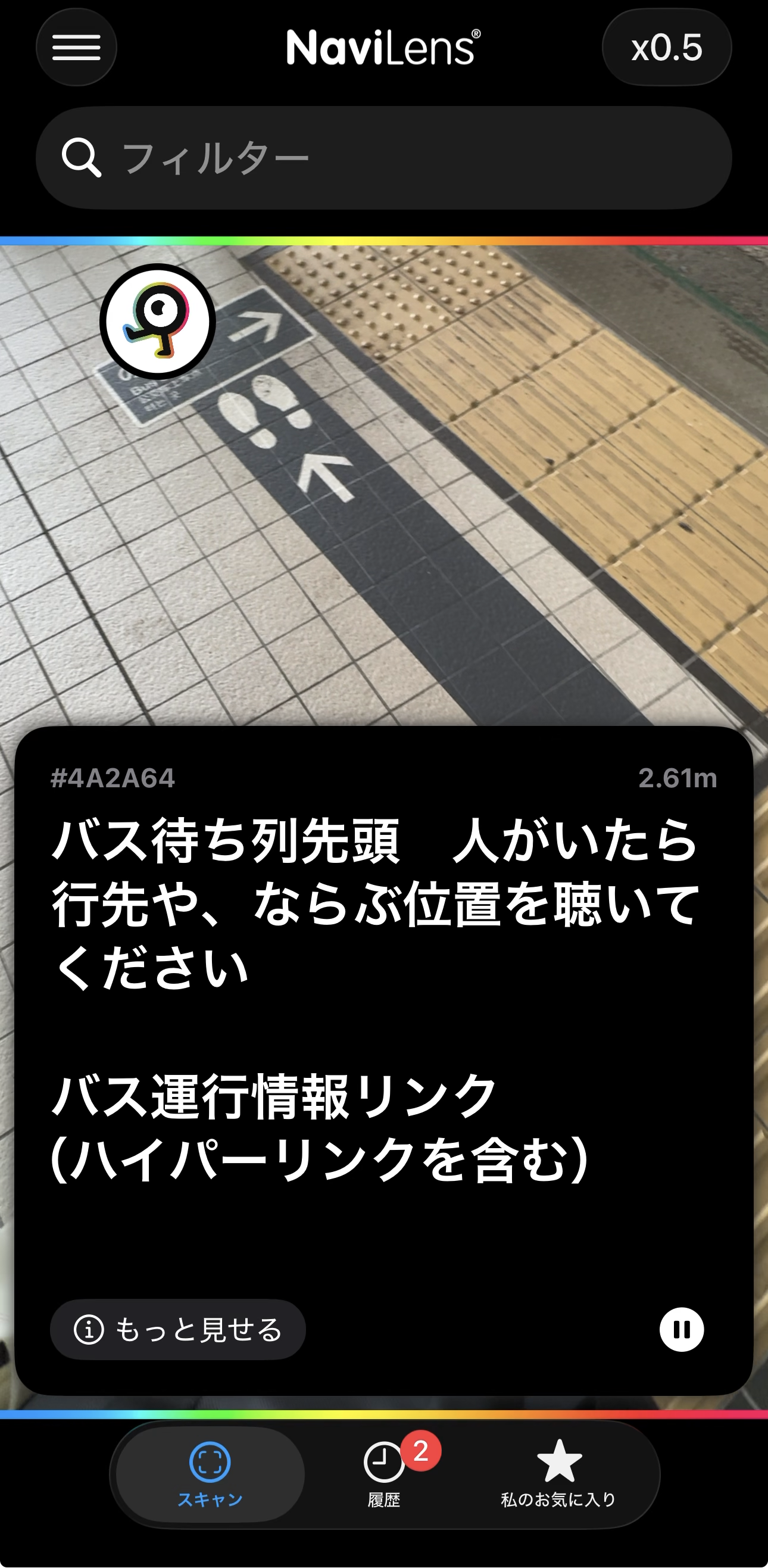 スペイン発祥の移動支援アプリで、各所に貼られているアクセシブルなナビレンスコードを読み込むことで、目的地の内容・方向・距離などの案内が表示されるとともに音声で読み上げます。施設内の移動支援だけでなく、バスや電車の乗り場案内や時刻案内なども読み上げることができます。「ナビレンス」を使うことで、視覚障害者が一人で移動する際の不安を和らげることができれば、より行動的になって視覚障害者の世界が広がります。そういったお手伝いをするアプリとなっています。