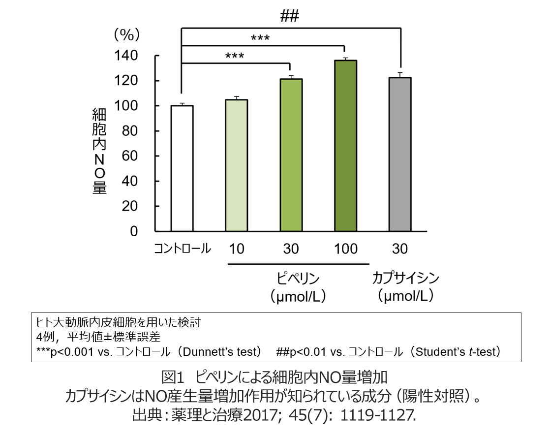 ヒト大動脈内皮細胞を培養し、ピペリンを添加して細胞内のNO量を測定しました。その結果、ピペリン30、100μ mol/Lを添加すると、ピペリンを添加しない場合に比べ、細胞内のNO量が有意に増加しました(図1)。この結果から、ピペリンはNO産生を促進することで血管を弛緩させ、血圧を低下させると考えられます。