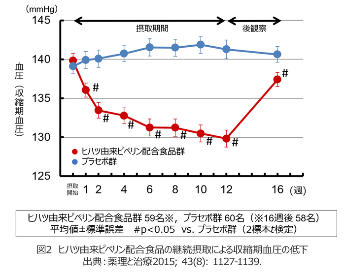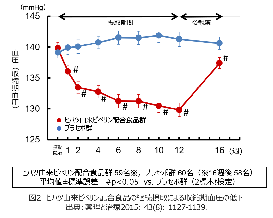② ヒハツ由来ピペリンを配合した食品を用いた臨床試験を行い、血圧が高めの方の血圧を下げる機能を確認しました。