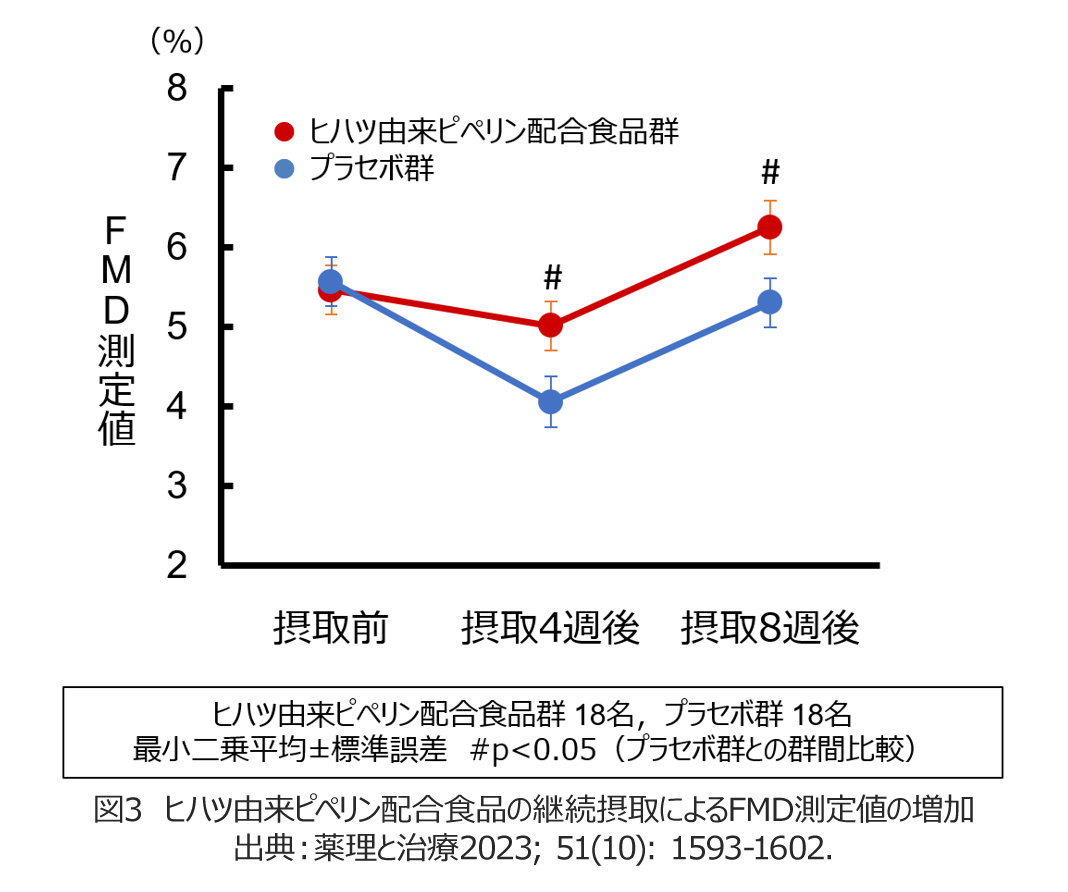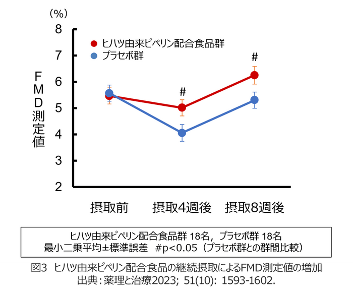 その結果、ヒハツ由来ピペリン配合食品を摂取した群では、プラセボ食品を摂取した群に比べFMD値が有意に高い値を示しました(図3)。FMD値が高いほど、血管が柔らかいことを意味します。