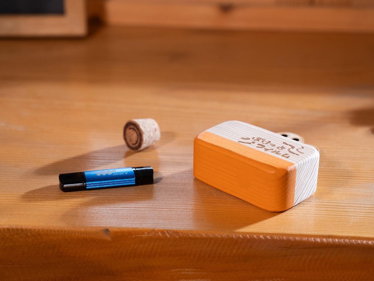 〈特徴〉Type-C対応USBメモリでスマートフォン再生が可能。かわいく飾れる吉野杉のケース。