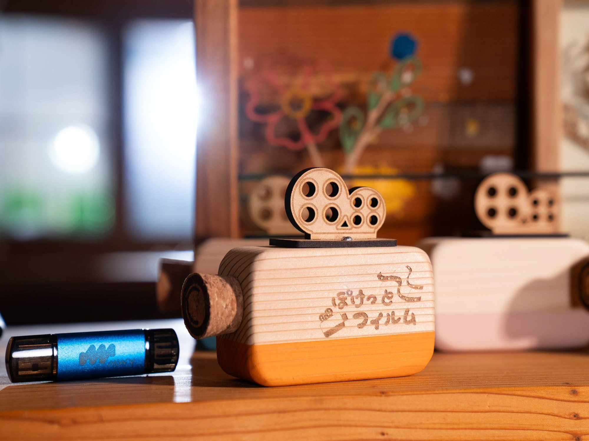 「ぽけっとフィルム」とは、500年以上の歴史をもつ吉野林業にて育てられた吉野杉を使用し、奈良県葛城市の木工作家 SUGGY(スッギー)氏(木育インストラクター)と株式会社MWVが共同開発した木製ケースです。レンズ型のコルクを外すと中には、スマートフォンに直接接続ができるUSBメモリーが入っています。地域の林業資源と職人の技を活かし、デザイン性・木育・地域活性化を兼ね備えた、子どもたちの想い出を未来へつなぐ商品です。