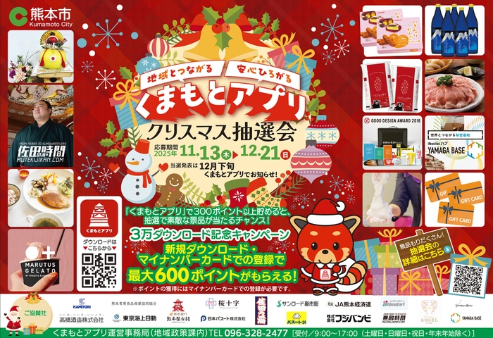 熊本市公式アプリ「くまもとアプリ」では、12月21日(日)まで、すてきな景品が当たる「クリスマス抽選会」を開催中です。