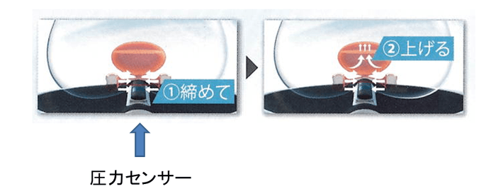 これを解決するために圧力センサーを内蔵した骨盤底筋トレーニング機器が開発されました。機器の上に座って体操をすることで骨盤底筋の動きを捉えた圧力センサーの信号をアプリに転送し、正しく骨盤底筋体操が出来ているかどうかがグラフ表示により使用者に簡単に判ります。