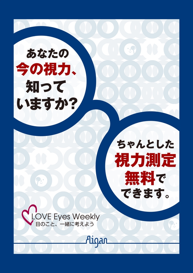 眼鏡専門店「 http://www.aigan.co.jp/ 」を運営する愛眼株式会社(本社:大阪市天王寺区、代表取締役社長:下條 三千夫)は、視力に係わるメガネを取り扱う企業として、「大切な視力」の事を考える機会を創出することを目的に、10月1日(月)から10日間、店舗にて無料で視力測定を行う「LOVE Eyes Weekly」を全国のメガネのアイガン245店舗にて開催いたします。