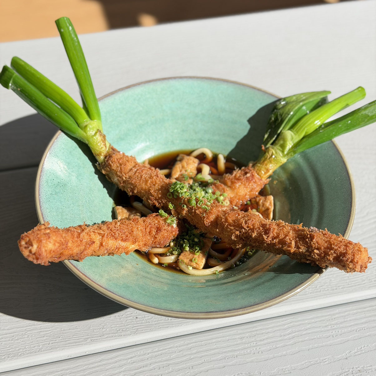 深谷ねぎ1本をのせた埼玉県産小麦粉を使用した蕎麦に雲丹をトッピングしました。温かいねぎポタージュつけ汁と温かいラー油つけ汁でお召し上がりいただけます。