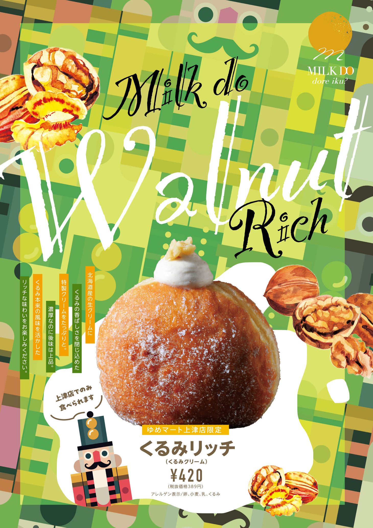 ゆめマート上津店限定商品として「くるみリッチ(くるみクリーム)」420円も販売。