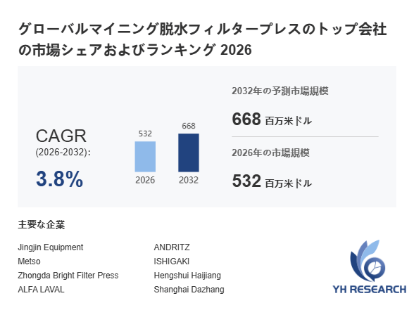 YHResearch調査チームの最新レポート「グローバルマイニング脱水フィルタープレスのトップ会社の市場シェアおよびランキング 2026」によると、2026年の532百万米ドルから2032年には668百万米ドルに成長し、2026年から2032年の間にCAGRは3.8%になると予測されています。