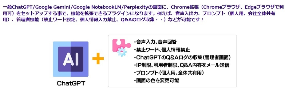クラウド環境、サテライト環境でのビジネス支援に特化したインターネットシステムソリューションベンダーである株式会社サテライトオフィス(本社:東京都江東区、代表取締役社長:原口 豊、 https://www.sateraito.jp )はChatGPT/Geminiなどの操作画面をカスタマイズする「サテライトAI・プラグイン」の提供を開始したことを発表します。Chrome拡張機能を利用したプラグインで音声入出力、プロンプト(個人・会社全体共有用)、管理者機能(禁止ワード設定、個人情報入力禁止、Q&Aのログ収集)などが可能になります。