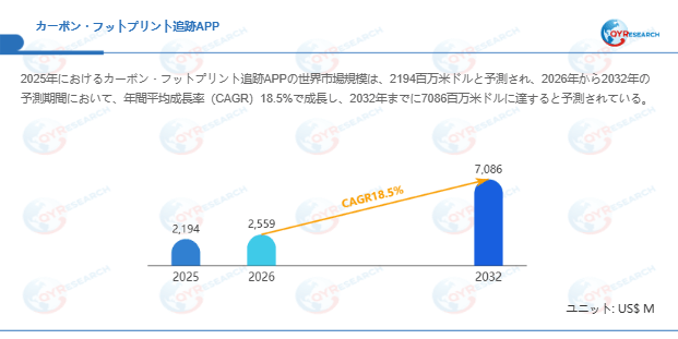 カーボン・フットプリント追跡APP市場は、脱炭素社会への移行と企業・個人の環境意識の高まりを背景に、急速な拡大局面にある。2025年の世界市場規模は2,194百万米ドルと予測され、2026年から2032年にかけて年平均成長率(CAGR)18.5%で成長し、2032年には7,086百万米ドルへ到達する見通しである。特にカーボン・フットプリント追跡APPは、個人の行動変容支援と企業のESG管理ツールとしての二面性を持ち、今後の環境データ基盤として重要性を増している。