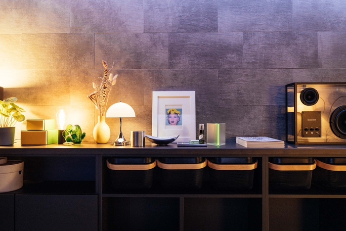 天井の側面とデスクの裏側には、部屋を間接的に照らすLEDテープライトを設置。