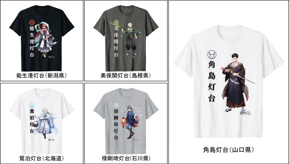 Amazon Merch on Demand(アマゾン マーチオンデマンド)にて好評販売中の『燈の守り人』アパレルグッズに、全国各地の“守り人”がデザインされたキャラクターTシャツシリーズが新たなラインナップとして登場します。現在、40体以上が公開されている “守り人”のキャラクターデザインには、それぞれの灯台の特色や地域のストーリーが盛り込まれており、それらの意匠を存分に楽しめるTシャツとなっています。今回、記念すべきシリーズ第一弾として登場するのは、角島灯台(山口県)、美保関灯台(島根県)、禄剛埼灯台(石川県)、能生港灯台(新潟県)、鴛泊灯台(北海道)、樫野埼灯台(和歌山県)、経ヶ岬灯台(京都府)、陸中黒埼灯台(岩手県)、潮岬灯台(和歌山県)、出雲日御碕灯台(島根県)の10灯台。今後も続々と、新たなキャラクターTシャツをお届けしますのでご期待ください。