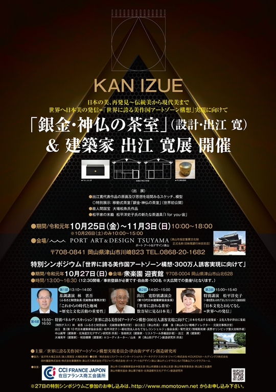 津山街デザイン創造研究所は、岡山県県北地域・旧美作国から、日本の伝統美から現代美を世界に発信し、年間300万人の誘客を目指す「美作国アートゾーン構想」の実現に向け、その活動の第一弾として、日本文化の茶の湯の精神の象徴である豊臣秀吉の「黄金の茶室」以来初の、建築芸術アートとなる新たな移動が可能な「銀金・神仏(かみほとけ)の茶室」を建築家・出江 寛氏が製作し、歴史的伝統のある津山の地で初公開します。また津山とゆかりのある金沢の漆芸家、人間国宝 故・大場 松魚氏の作品、そして水戸徳川家の末裔 松平 洋史子氏の新たな茶道具「I for you・宙」をあわせて展示する「出江 寛展」及び、日本を代表する建築家・文化人が津山に集結して特別シンポジウムを開催いたします。