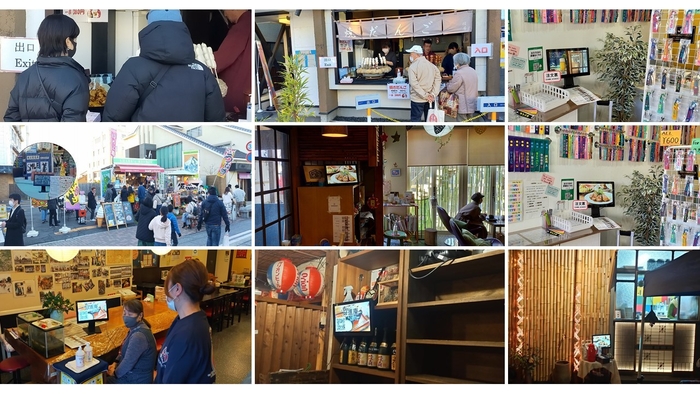 商店街複数の店舗にデジタルサイネージを設置し、お互いの店舗の宣伝を行います。