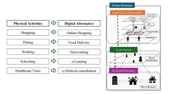 ・オンライン上のソーシャルネットワーク:デジタルサービスを多く利用する人は、対面での人間関係よりも、SNSなどのオンライン上での関係性を重視する傾向にあり、社会的結束力や災害対応、地域の安全システムにも影響を与える可能性があります。こうした行動の変化は、単なる利便性の問題ではなく、都市インフラや社会関係、そして都市の長期的な持続可能性そのものを変えつつあります。