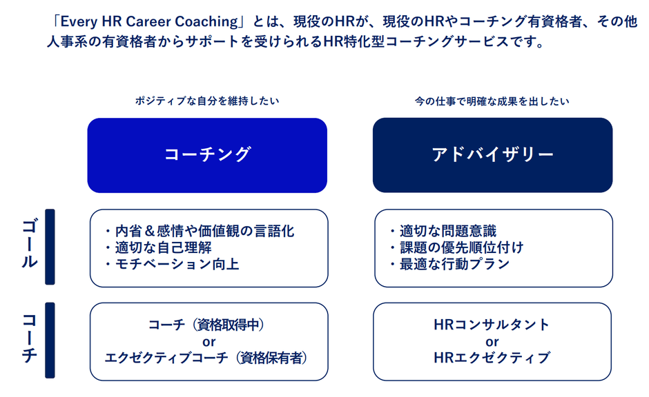 「Every HR Career Coaching」は、現役のHRが、現役のHRやコーチング有資格者、その他人事系の有資格者からサポートを受けられるHR特化型コーチング・アドバイザリーサービスです。内省を促進しもやもやを解消するコーチング、より実践的なサポートを受けることが出来るアドバイザリーの2種類からコーチを選ぶことができます。