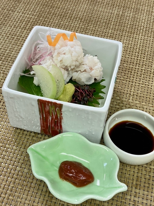 ◎鱧の湯引き:新鮮で瑞々しい鱧の刺身を、丁寧な手法で美しく盛り合わせました。