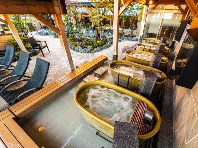 お風呂は、女性日替わり湯が『超軟水の日替わり湯』にグレードアップしました。水に含まれるカルシウムイオンなどの硬度成分を限りなくゼロに近くしつるつるとした肌触りが特徴です。さらに『美泡の壺湯』は底から大量の気泡が湧き出る事で、お肌の汚れや老廃物を取り除くマッサージ効果が期待されます。男性露天エリアには唯一潜れる『深々の湯』、無数のきめ細かい泡がお湯全体に広がる『泡々の湯』が新たに登場します。男性サウナはオートロウリュマシンがグレードアップ。これまで以上に本格的な熱気と湿気のハーモニーでサウナの醍醐味と快適さをお楽しみいただけます。