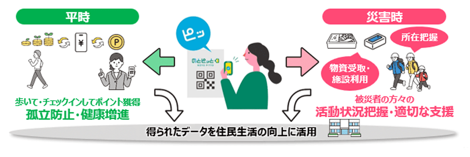 また、平時にはQRコードを読み取ることでポイントを獲得できます。獲得したポイントは、買い物などに利用でき、デジタルタッチの習慣化を促進します。歩数計測アプリ・みまもりメール・ポイントサービスなどとの連携も可能なため、日常生活における住民サービスにも寄与します。