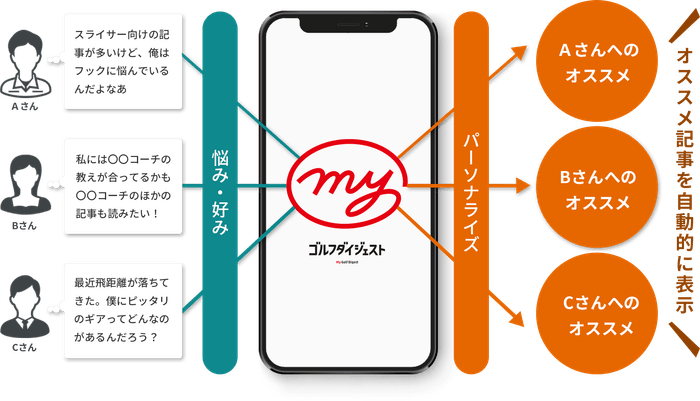 「Myゴルフダイジェスト」は、「週刊ゴルフダイジェスト」「月刊ゴルフダイジェスト」をはじめとした、ゴルフダイジェスト社の雑誌や書籍・コミック等のコンテンツを、ウェブ上で閲覧できる定額課金制サービスです。利用料は月額720円(税別)。単に記事が読めるだけでなく、ユーザーの悩みや好みに応じて、最適なコンテンツを自動的に配信する「パーソナライズ機能」を搭載。情報が溢れ、真に自分に合った情報が何かを判断するのが難しい昨今、業界No.1の老舗ゴルフ媒体社が紡ぎ出す信頼のおけるコンテンツの中から、個々のゴルファーにマッチした情報をピックアップして届けることで、各々のゴルフライフをより楽しく、充実したものへと転化してまいります。