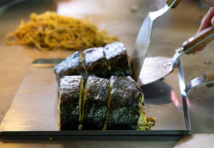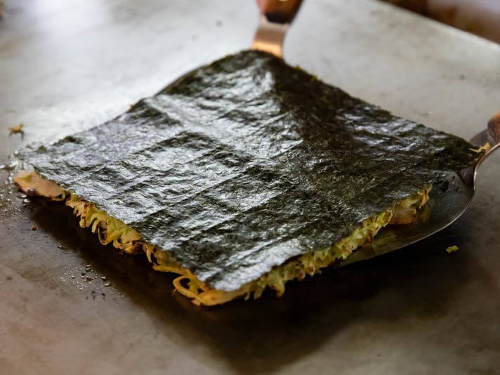 関西風のお好み焼を四角の形に焼いた後、焼海苔を貼り付けています。外見は黒く、一般的なお好み焼とは異なる見た目ですが、焼海苔の風味がソースの味わいを引き立てています。