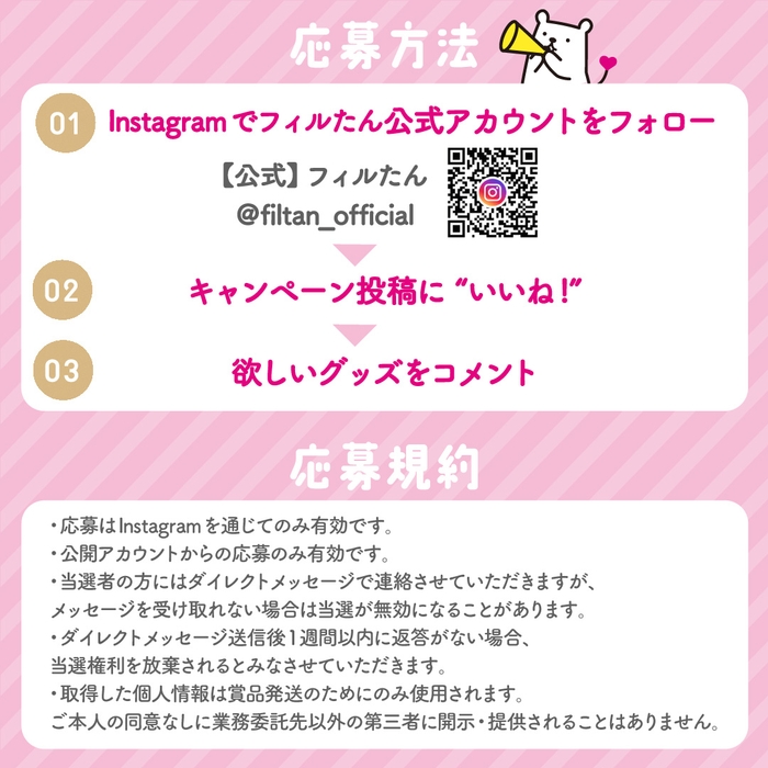 当選の方へ、下記Instagramフィルたん公式アカウントよりダイレクトメッセージにてご連絡させていただきます。