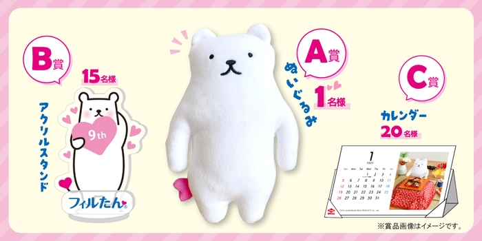 Instagramでフィルたん公式アカウントをフォロー&キャンペーン投稿に“いいね”して、欲しいグッズをコメントすることで応募できます。賞品には超レアなフィルたんぬいぐるみやアクリルスタンド、カレンダーを抽選でプレゼントいたします。詳細をご確認の上、ぜひご参加ください。